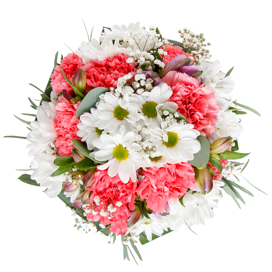 Discover the radiant elegance and uniqueness of our stunning flower arrangement. This radiant bouquet features a blend of snow-white chrysanthemums, delicate gypsophila, soft light pink carnations, and vibrant aspidistra leaves, meticulously arranged to create a breathtaking display.